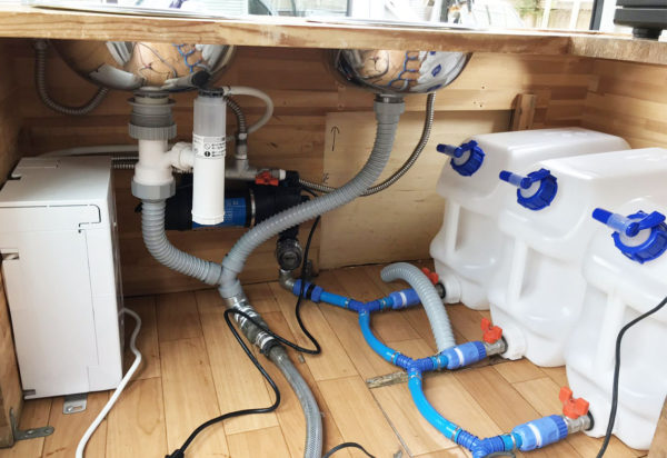 排水のタンクは車外に置き、一つとみなすためにホースで繋げてあります。